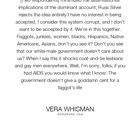 [Two respondents] minimized the assimilationist implications of the dominant account; Russ Silver rejects the idea entirely.I have no interest in being accepted. I consider this system corrupt, and I don't want to be accepted by it. We're in this together. Faggots, junkies, women, blacks, Hispanics, Native Americans, Asians, don't you see it? Don't you see that our white male government doesn't care about us? When I say this it shocks coat-and-tie lesbians and gay men everywhere. Well, I'm sorry, folks; if you had AIDS you would know what I know: The government doesn't give a goddamn cent for a faggot's life