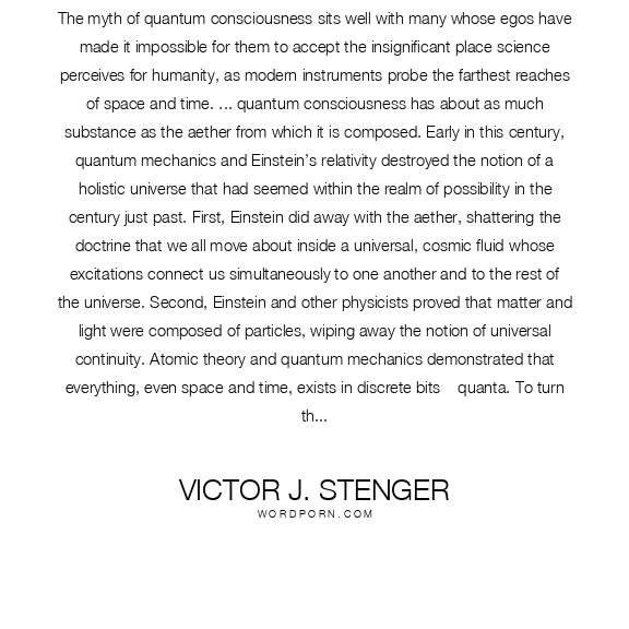 The myth of quantum consciousness sits well with many whose egos have made it impossible for them to accept the insignificant place science perceives for humanity, as modern instruments probe the farthest reaches of space and time. ... quantum consciousness has about as much substance as the aether from which it is composed. Early in this century, quantum mechanics and Einstein’s relativity destroyed the notion of a holistic universe that had seemed within the realm of possibility in the century just past. First, Einstein did away with the aether, shattering the doctrine that we all move about inside a universal, cosmic fluid whose excitations connect us simultaneously to one another and to the rest of the universe. Second, Einstein and other physicists proved that matter and light were composed of particles, wiping away the notion of universal continuity. Atomic theory and quantum mechanics demonstrated that everything, even space and time, exists in discrete bits – quanta. To turn this around and say that twentieth century physics initiated some new holistic view of the universe is a complete misrepresentation of what actually took place. ... The myth of quantum consciousness should take its place along with gods, unicorns, and dragons as yet another product of the fantasies of people unwilling to accept what science, reason, and their own eyes tell them about the world