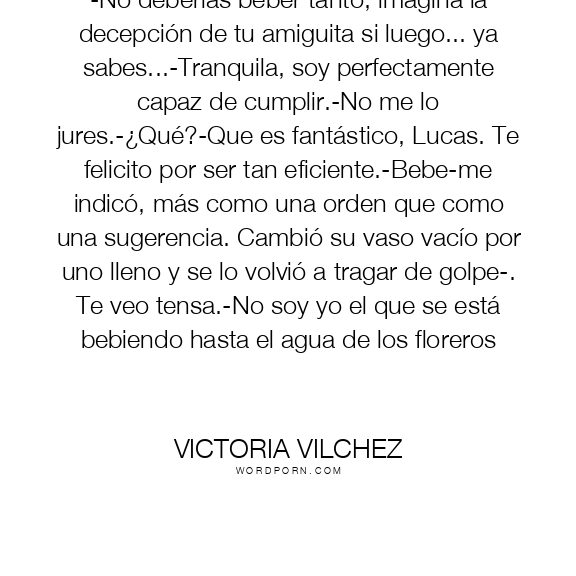 -No deberías beber tanto, imagina la decepción de tu amiguita si luego... ya sabes...-Tranquila, soy perfectamente capaz de cumplir.-No me lo jures.-¿Qué?-Que es fantástico, Lucas. Te felicito por ser tan eficiente.-Bebe-me indicó, más como una orden que como una sugerencia. Cambió su vaso vacío por uno lleno y se lo volvió a tragar de golpe-. Te veo tensa.-No soy yo el que se está bebiendo hasta el agua de los floreros