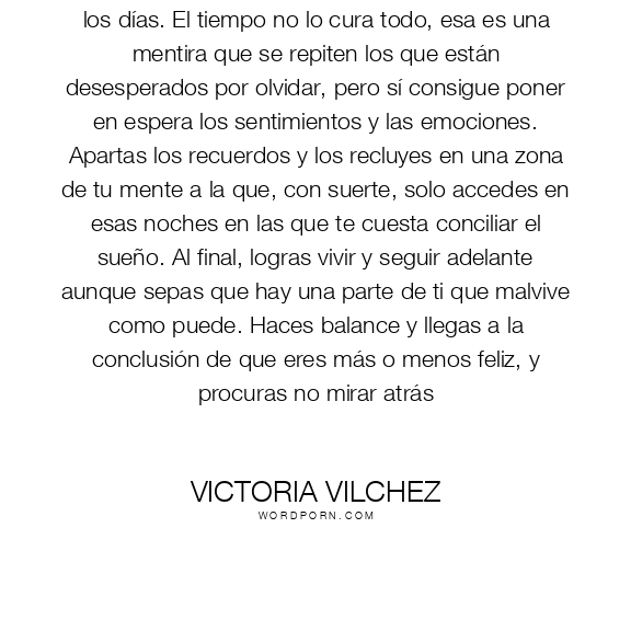 Todo lo que puedo hacer es esperar, dejar pasar los días. El tiempo no lo cura todo, esa es una mentira que se repiten los que están desesperados por olvidar, pero sí consigue poner en espera los sentimientos y las emociones. Apartas los recuerdos y los recluyes en una zona de tu mente a la que, con suerte, solo accedes en esas noches en las que te cuesta conciliar el sueño. Al final, logras vivir y seguir adelante aunque sepas que hay una parte de ti que malvive como puede. Haces balance y llegas a la conclusión de que eres más o menos feliz, y procuras no mirar atrás