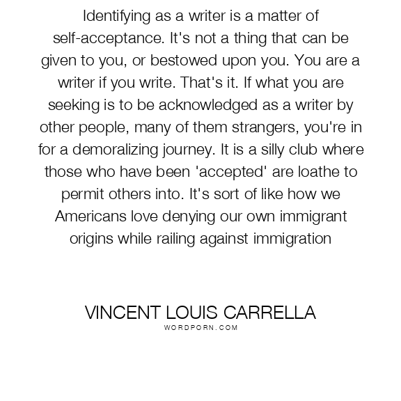 Identifying as a writer is a matter of self-acceptance. It's not a thing that can be given to you, or bestowed upon you. You are a writer if you write. That's it. If what you are seeking is to be acknowledged as a writer by other people, many of them strangers, you're in for a demoralizing journey. It is a silly club where those who have been 'accepted' are loathe to permit others into. It's sort of like how we Americans love denying our own immigrant origins while railing against immigration