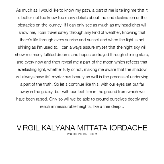 As much as I would like to know my path, a part of me is telling me that it is better not too know too many details about the end destination or the obstacles on the journey. If I can only see as much as my headlights will show me, I can travel safely through any kind of weather, knowing that there's life through every sunrise and sunset and when the light is not shining as I'm used to, I can always assure myself that the night sky will show me many fulfilled dreams and hopes portrayed through shining stars, and every now and then reveal me a part of the moon which reflects that everlasting light, whether fully or not, making me aware that the shadow will always have its' mysterious beauty as well in the process of underlying a part of the truth. So let's continue like this, with our eyes set out far away in the galaxy, but with our feet firm in the ground from which we have been raised. Only so will we be able to ground ourselves deeply and reach immeasurable heights, like a tree deeply rooted in mother Earth that stretches its' branches up to the heavens