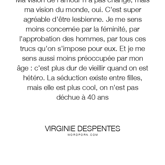 Ma vision de l'amour n'a pas changé, mais ma vision du monde, oui. C'est super agréable d'être lesbienne. Je me sens moins concernée par la féminité, par l'approbation des hommes, par tous ces trucs qu'on s'impose pour eux. Et je me sens aussi moins préoccupée par mon âge : c'est plus dur de vieillir quand on est hétéro. La séduction existe entre filles, mais elle est plus cool, on n'est pas déchue à 40 ans