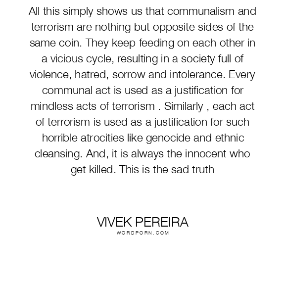 All this simply shows us that communalism and terrorism are nothing but opposite sides of the same coin. They keep feeding on each other in a vicious cycle, resulting in a society full of violence, hatred, sorrow and intolerance. Every communal act is used as a justification for mindless acts of terrorism . Similarly , each act of terrorism is used as a justification for such horrible atrocities like genocide and ethnic cleansing. And, it is always the innocent who get killed. This is the sad truth
