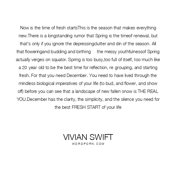 Now is the time of fresh startsThis is the season that makes everything new.There is a longstanding rumor that Spring is the timeof renewal, but that's only if you ignore the depressingclutter and din of the season. All that floweringand budding and birthing--- the messy youthfulnessof Spring actually verges on squalor. Spring is too busy,too full of itself, too much like a 20-year-old to be the best time for reflection, re-grouping, and starting fresh. For that you need December. You need to have lived through the mindless biological imperatives of your life (to bud, and flower, and show off) before you can see that a landscape of new fallen snow is THE REAL YOU.December has the clarity, the simplicity, and the silence you need for the best FRESH START of your life