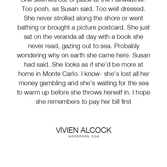She seemed out of place at the Fairweather. Too posh, as Susan said. Too well dressed. She never strolled along the shore or went bathing or brought a picture postcard. She just sat on the veranda all day with a book she never read, gazing out to sea. Probably wondering why on earth she came here. Susan had said. She looks as if she'd be more at home in Monte Carlo. I know- she's lost all her money gambling and she's waiting for the sea to warm up before she throws herself in. I hope she remembers to pay her bill first