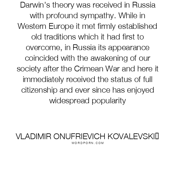 Darwin's theory was received in Russia with profound sympathy. While in Western Europe it met firmly established old traditions which it had first to overcome, in Russia its appearance coincided with the awakening of our society after the Crimean War and here it immediately received the status of full citizenship and ever since has enjoyed widespread popularity