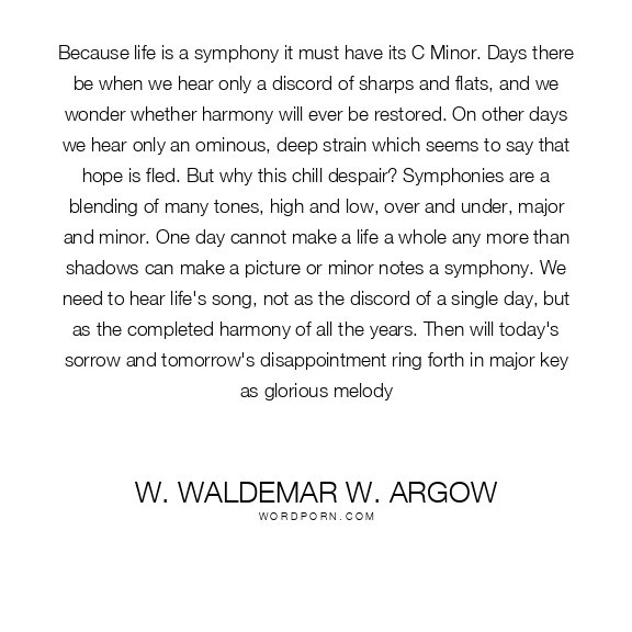 Because life is a symphony it must have its C Minor. Days there be when we hear only a discord of sharps and flats, and we wonder whether harmony will ever be restored. On other days we hear only an ominous, deep strain which seems to say that hope is fled. But why this chill despair? Symphonies are a blending of many tones, high and low, over and under, major and minor. One day cannot make a life a whole any more than shadows can make a picture or minor notes a symphony. We need to hear life's song, not as the discord of a single day, but as the completed harmony of all the years. Then will today's sorrow and tomorrow's disappointment ring forth in major key as glorious melody