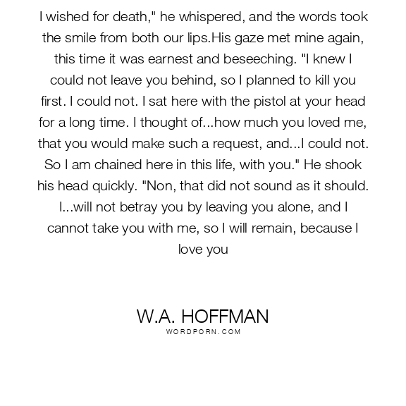 I wished for death," he whispered, and the words took the smile from both our lips.His gaze met mine again, this time it was earnest and beseeching. "I knew I could not leave you behind, so I planned to kill you first. I could not. I sat here with the pistol at your head for a long time. I thought of...how much you loved me, that you would make such a request, and...I could not. So I am chained here in this life, with you." He shook his head quickly. "Non, that did not sound as it should. I...will not betray you by leaving you alone, and I cannot take you with me, so I will remain, because I love you
