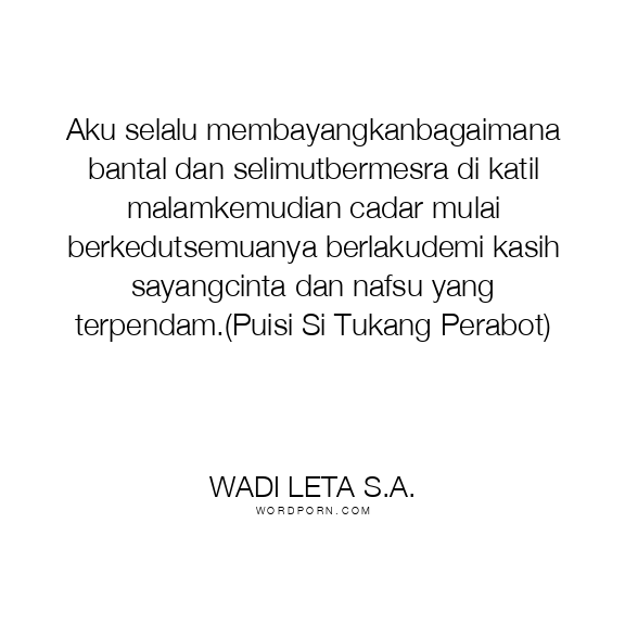 Aku selalu membayangkanbagaimana bantal dan selimutbermesra di katil malamkemudian cadar mulai berkedutsemuanya berlakudemi kasih sayangcinta dan nafsu yang terpendam.(Puisi Si Tukang Perabot)