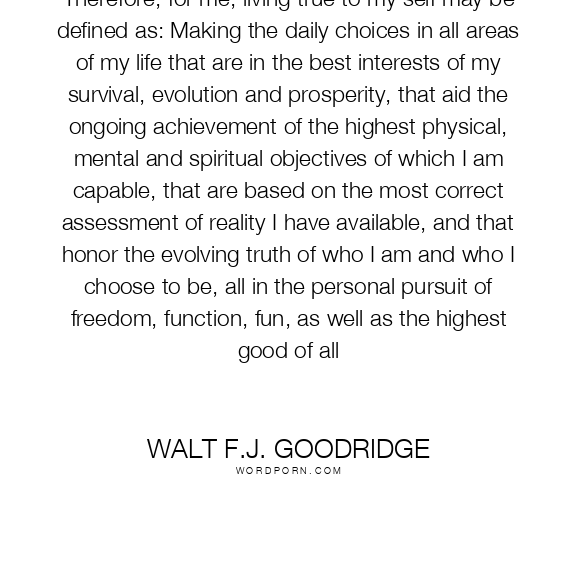 Therefore, for me, living true to my self may be defined as: Making the daily choices in all areas of my life that are in the best interests of my survival, evolution and prosperity, that aid the ongoing achievement of the highest physical, mental and spiritual objectives of which I am capable, that are based on the most correct assessment of reality I have available, and that honor the evolving truth of who I am and who I choose to be, all in the personal pursuit of freedom, function, fun, as well as the highest good of all