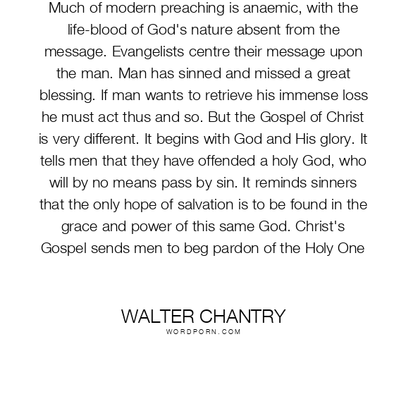 Much of modern preaching is anaemic, with the life-blood of God's nature absent from the message. Evangelists centre their message upon the man. Man has sinned and missed a great blessing. If man wants to retrieve his immense loss he must act thus and so. But the Gospel of Christ is very different. It begins with God and His glory. It tells men that they have offended a holy God, who will by no means pass by sin. It reminds sinners that the only hope of salvation is to be found in the grace and power of this same God. Christ's Gospel sends men to beg pardon of the Holy One