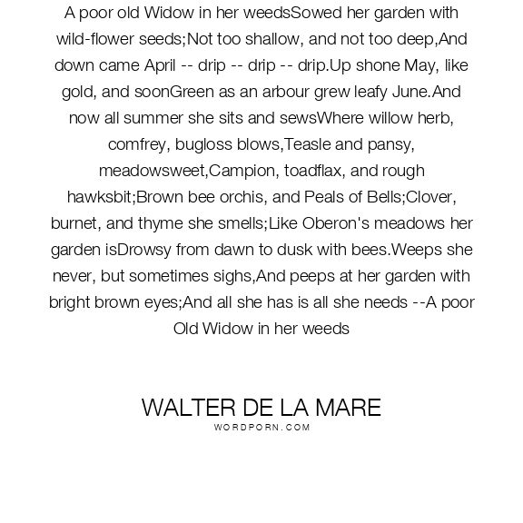 A poor old Widow in her weedsSowed her garden with wild-flower seeds;Not too shallow, and not too deep,And down came April -- drip -- drip -- drip.Up shone May, like gold, and soonGreen as an arbour grew leafy June.And now all summer she sits and sewsWhere willow herb, comfrey, bugloss blows,Teasle and pansy, meadowsweet,Campion, toadflax, and rough hawksbit;Brown bee orchis, and Peals of Bells;Clover, burnet, and thyme she smells;Like Oberon's meadows her garden isDrowsy from dawn to dusk with bees.Weeps she never, but sometimes sighs,And peeps at her garden with bright brown eyes;And all she has is all she needs --A poor Old Widow in her weeds