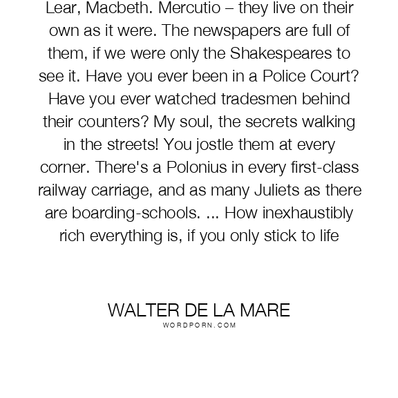 Lear, Macbeth. Mercutio – they live on their own as it were. The newspapers are full of them, if we were only the Shakespeares to see it. Have you ever been in a Police Court? Have you ever watched tradesmen behind their counters? My soul, the secrets walking in the streets! You jostle them at every corner. There's a Polonius in every first-class railway carriage, and as many Juliets as there are boarding-schools. ... How inexhaustibly rich everything is, if you only stick to life