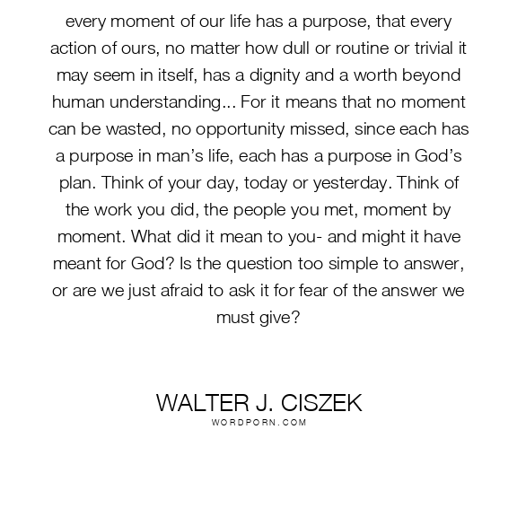 every moment of our life has a purpose, that every action of ours, no matter how dull or routine or trivial it may seem in itself, has a dignity and a worth beyond human understanding... For it means that no moment can be wasted, no opportunity missed, since each has a purpose in man’s life, each has a purpose in God’s plan. Think of your day, today or yesterday. Think of the work you did, the people you met, moment by moment. What did it mean to you- and might it have meant for God? Is the question too simple to answer, or are we just afraid to ask it for fear of the answer we must give?