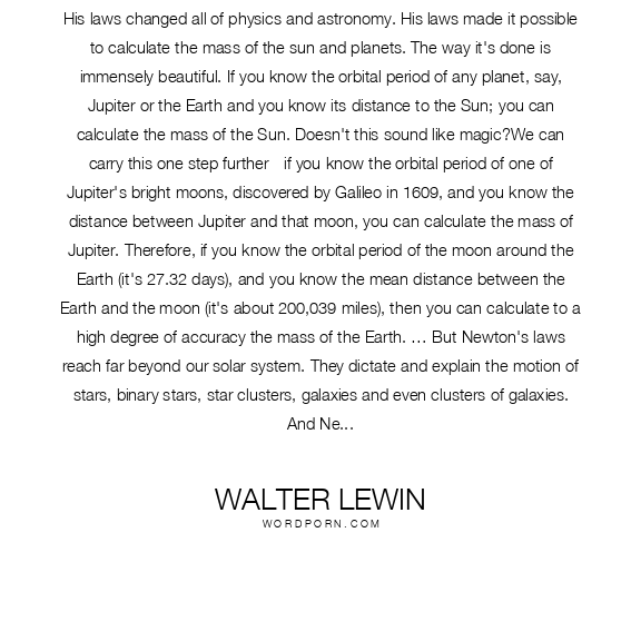 His laws changed all of physics and astronomy. His laws made it possible to calculate the mass of the sun and planets. The way it's done is immensely beautiful. If you know the orbital period of any planet, say, Jupiter or the Earth and you know its distance to the Sun; you can calculate the mass of the Sun. Doesn't this sound like magic?We can carry this one step further - if you know the orbital period of one of Jupiter's bright moons, discovered by Galileo in 1609, and you know the distance between Jupiter and that moon, you can calculate the mass of Jupiter. Therefore, if you know the orbital period of the moon around the Earth (it's 27.32 days), and you know the mean distance between the Earth and the moon (it's about 200,039 miles), then you can calculate to a high degree of accuracy the mass of the Earth. … But Newton's laws reach far beyond our solar system. They dictate and explain the motion of stars, binary stars, star clusters, galaxies and even clusters of galaxies. And Newton's laws deserve credit for the 20th century discovery of what we call dark matter. His laws are beautiful. Breathtakingly simple and incredibly powerful at the same time. They explain so much and the range of phenomena they clarify is mind boggling. By bringing together the physics of motion, of interaction between objects and of planetary movements, Newton brought a new kind of order to astronomical measurements, showing how, what had been a jumble of confused observations made through the centuries were all interconnected