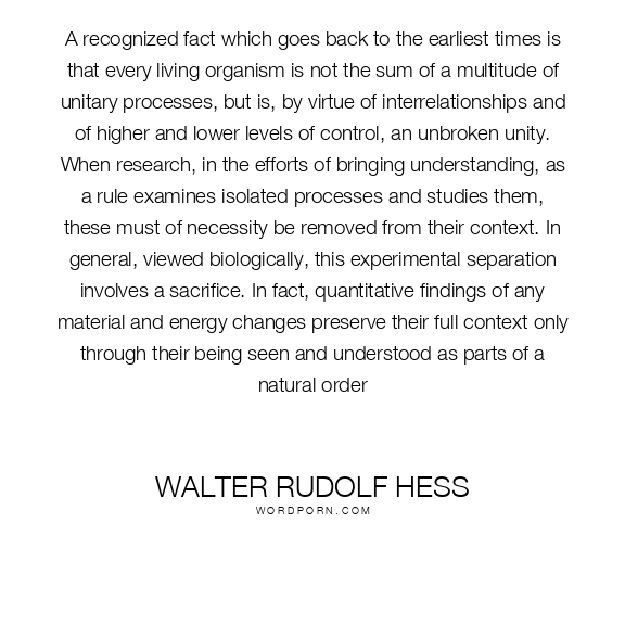 A recognized fact which goes back to the earliest times is that every living organism is not the sum of a multitude of unitary processes, but is, by virtue of interrelationships and of higher and lower levels of control, an unbroken unity. When research, in the efforts of bringing understanding, as a rule examines isolated processes and studies them, these must of necessity be removed from their context. In general, viewed biologically, this experimental separation involves a sacrifice. In fact, quantitative findings of any material and energy changes preserve their full context only through their being seen and understood as parts of a natural order