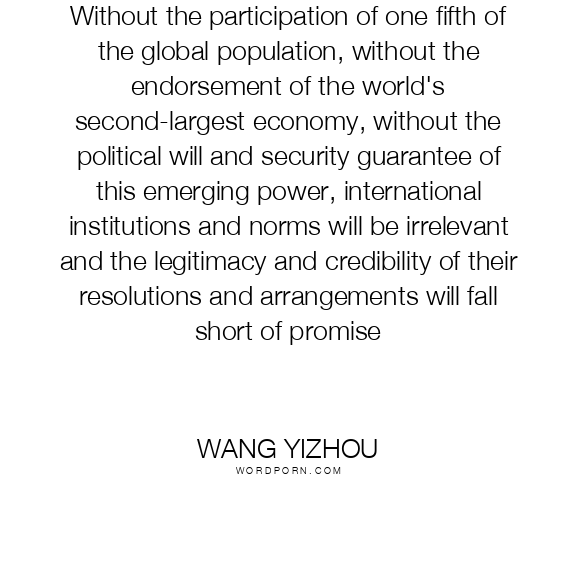 Without the participation of one fifth of the global population, without the endorsement of the world's second-largest economy, without the political will and security guarantee of this emerging power, international institutions and norms will be irrelevant and the legitimacy and credibility of their resolutions and arrangements will fall short of promise