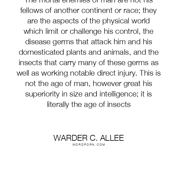 The mortal enemies of man are not his fellows of another continent or race; they are the aspects of the physical world which limit or challenge his control, the disease germs that attack him and his domesticated plants and animals, and the insects that carry many of these germs as well as working notable direct injury. This is not the age of man, however great his superiority in size and intelligence; it is literally the age of insects