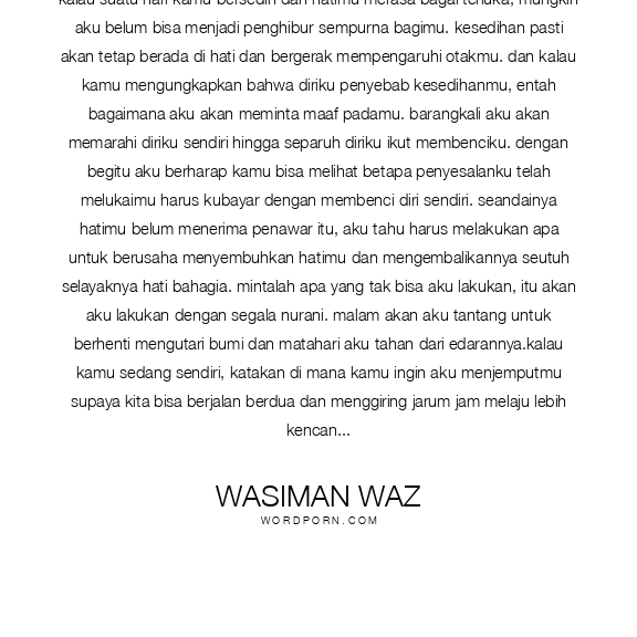 kalau suatu hari kamu bersedih dan hatimu merasa bagai terluka, mungkin aku belum bisa menjadi penghibur sempurna bagimu. kesedihan pasti akan tetap berada di hati dan bergerak mempengaruhi otakmu. dan kalau kamu mengungkapkan bahwa diriku penyebab kesedihanmu, entah bagaimana aku akan meminta maaf padamu. barangkali aku akan memarahi diriku sendiri hingga separuh diriku ikut membenciku. dengan begitu aku berharap kamu bisa melihat betapa penyesalanku telah melukaimu harus kubayar dengan membenci diri sendiri. seandainya hatimu belum menerima penawar itu, aku tahu harus melakukan apa untuk berusaha menyembuhkan hatimu dan mengembalikannya seutuh selayaknya hati bahagia. mintalah apa yang tak bisa aku lakukan, itu akan aku lakukan dengan segala nurani. malam akan aku tantang untuk berhenti mengutari bumi dan matahari aku tahan dari edarannya.kalau kamu sedang sendiri, katakan di mana kamu ingin aku menjemputmu supaya kita bisa berjalan berdua dan menggiring jarum jam melaju lebih kencang. tunjuklah titik kecil di langit malam, aku akan mendekati malaikat dan merayunya agar rela mengantarku mengambilnya dan memberikannya padamu agar menemanimu dan kesepian menjauhimu. kalau kamu sedang sendirian di dekat jendela kamarmu sambil menungguku, lihatlah ke arah utara, angin gunung mengantarkan rinduku buatmu. kalau hari ini kamu adalah diriku, cintailah dengan hatimu