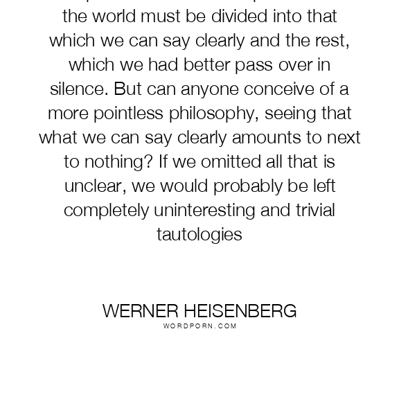 The positivists have a simple solution: the world must be divided into that which we can say clearly and the rest, which we had better pass over in silence. But can anyone conceive of a more pointless philosophy, seeing that what we can say clearly amounts to next to nothing? If we omitted all that is unclear, we would probably be left completely uninteresting and trivial tautologies