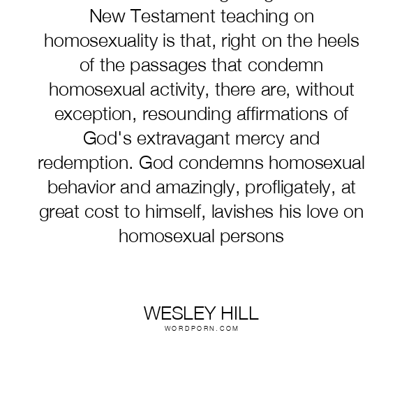 One of the most striking things about the New Testament teaching on homosexuality is that, right on the heels of the passages that condemn homosexual activity, there are, without exception, resounding affirmations of God's extravagant mercy and redemption. God condemns homosexual behavior and amazingly, profligately, at great cost to himself, lavishes his love on homosexual persons