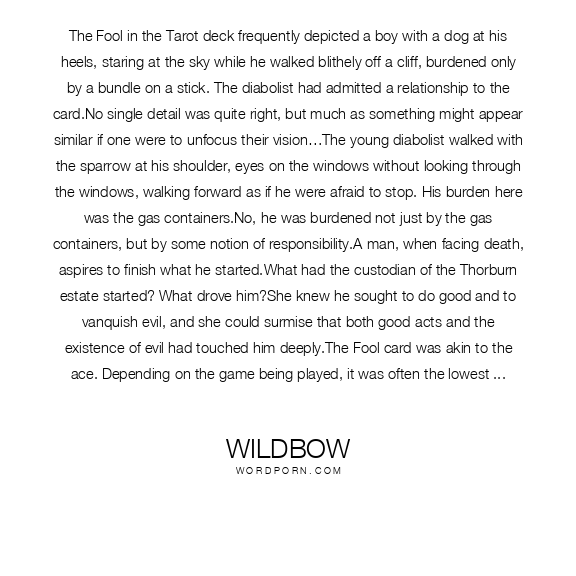 The Fool in the Tarot deck frequently depicted a boy with a dog at his heels, staring at the sky while he walked blithely off a cliff, burdened only by a bundle on a stick. The diabolist had admitted a relationship to the card.No single detail was quite right, but much as something might appear similar if one were to unfocus their vision…The young diabolist walked with the sparrow at his shoulder, eyes on the windows without looking through the windows, walking forward as if he were afraid to stop. His burden here was the gas containers.No, he was burdened not just by the gas containers, but by some notion of responsibility.A man, when facing death, aspires to finish what he started.What had the custodian of the Thorburn estate started? What drove him?She knew he sought to do good and to vanquish evil, and she could surmise that both good acts and the existence of evil had touched him deeply.The Fool card was akin to the ace. Depending on the game being played, it was often the lowest card or the highest. Valueless or highly valued. Powerless or powerful.It all depended on context. He sought to kill the demon, and he would either catastrophically fail or succeed.This Fool sought to slay the metaphorical dragon. He felt his own mortality, which was quite possibly her fault, in part, and now he rushed to finish the task he’d set for himself. To better the world.The Fool was wrought with air – the clouds he gazed at, the void beyond the cliff, the feather in his cap, even the dog could often be found mid-step, bounding, just above the ground.He was a Fool wrought with a different element. The familiar didn’t quite fit for the departure from the air, but the traditional dog didn’t conjure ideas of air right off the bat either.What was he wrought with? That was another question that begged an answer