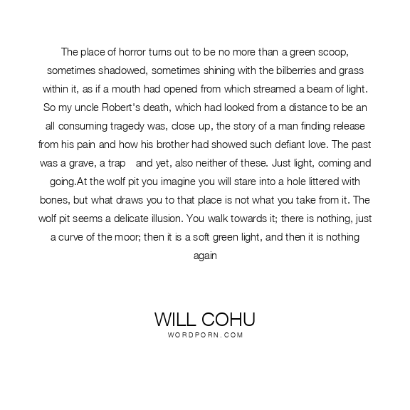 The place of horror turns out to be no more than a green scoop, sometimes shadowed, sometimes shining with the bilberries and grass within it, as if a mouth had opened from which streamed a beam of light. So my uncle Robert's death, which had looked from a distance to be an all-consuming tragedy was, close-up, the story of a man finding release from his pain and how his brother had showed such defiant love. The past was a grave, a trap - and yet, also neither of these. Just light, coming and going.At the wolf pit you imagine you will stare into a hole littered with bones, but what draws you to that place is not what you take from it. The wolf pit seems a delicate illusion. You walk towards it; there is nothing, just a curve of the moor; then it is a soft green light, and then it is nothing again