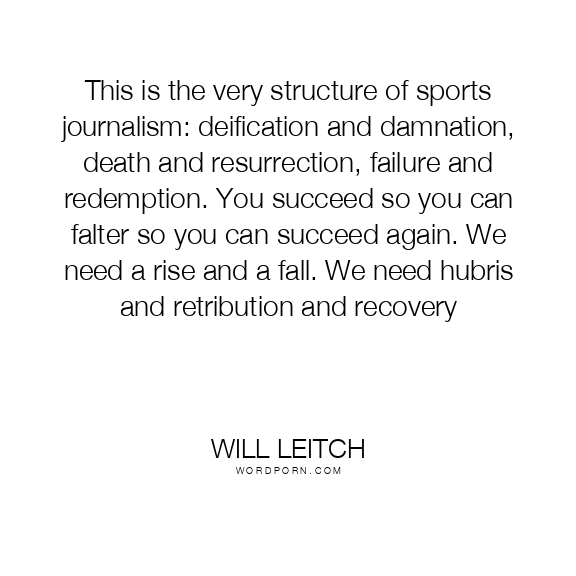 This is the very structure of sports journalism: deification and damnation, death and resurrection, failure and redemption. You succeed so you can falter so you can succeed again. We need a rise and a fall. We need hubris and retribution and recovery
