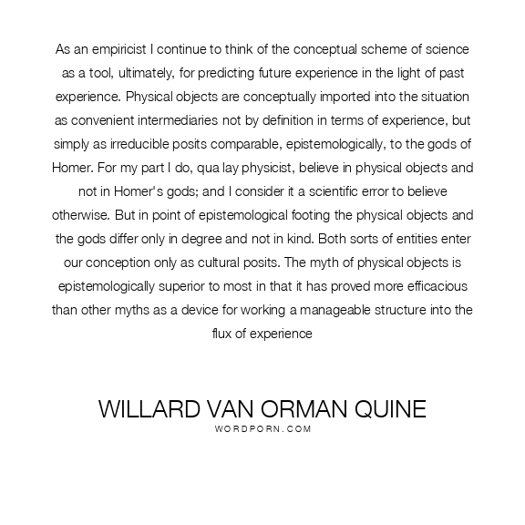 As an empiricist I continue to think of the conceptual scheme of science as a tool, ultimately, for predicting future experience in the light of past experience. Physical objects are conceptually imported into the situation as convenient intermediaries-not by definition in terms of experience, but simply as irreducible posits comparable, epistemologically, to the gods of Homer. For my part I do, qua lay physicist, believe in physical objects and not in Homer's gods; and I consider it a scientific error to believe otherwise. But in point of epistemological footing the physical objects and the gods differ only in degree and not in kind. Both sorts of entities enter our conception only as cultural posits. The myth of physical objects is epistemologically superior to most in that it has proved more efficacious than other myths as a device for working a manageable structure into the flux of experience