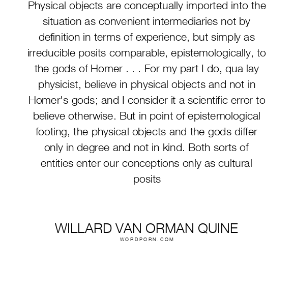 Physical objects are conceptually imported into the situation as convenient intermediaries not by definition in terms of experience, but simply as irreducible posits comparable, epistemologically, to the gods of Homer . . . For my part I do, qua lay physicist, believe in physical objects and not in Homer's gods; and I consider it a scientific error to believe otherwise. But in point of epistemological footing, the physical objects and the gods differ only in degree and not in kind. Both sorts of entities enter our conceptions only as cultural posits