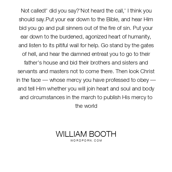 Not called!' did you say?'Not heard the call,' I think you should say.Put your ear down to the Bible, and hear Him bid you go and pull sinners out of the fire of sin. Put your ear down to the burdened, agonized heart of humanity, and listen to its pitiful wail for help. Go stand by the gates of hell, and hear the damned entreat you to go to their father's house and bid their brothers and sisters and servants and masters not to come there. Then look Christ in the face — whose mercy you have professed to obey — and tell Him whether you will join heart and soul and body and circumstances in the march to publish His mercy to the world
