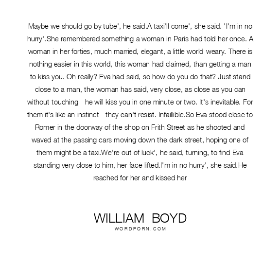 Maybe we should go by tube', he said.A taxi'll come', she said. 'I'm in no hurry'.She remembered something a woman in Paris had told her once. A woman in her forties, much married, elegant, a little world-weary. There is nothing easier in this world, this woman had claimed, than getting a man to kiss you. Oh really? Eva had said, so how do you do that? Just stand close to a man, the woman has said, very close, as close as you can without touching - he will kiss you in one minute or two. It's inevitable. For them it's like an instinct - they can't resist. Infaillible.So Eva stood close to Romer in the doorway of the shop on Frith Street as he shooted and waved at the passing cars moving down the dark street, hoping one of them might be a taxi.We're out of luck', he said, turning, to find Eva standing very close to him, her face lifted.I'm in no hurry', she said.He reached for her and kissed her