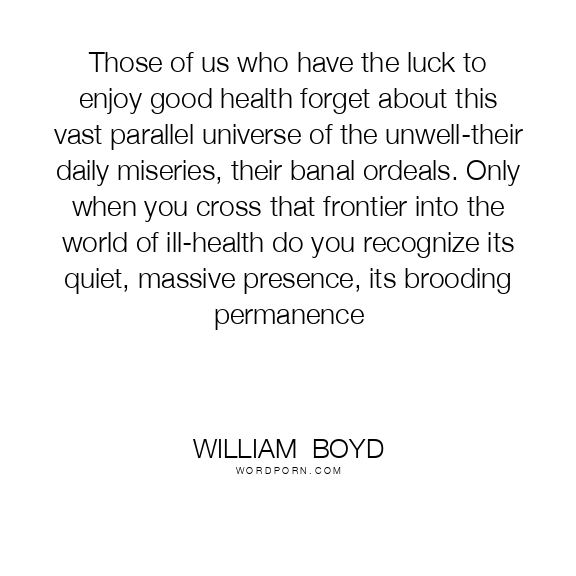 Those of us who have the luck to enjoy good health forget about this vast parallel universe of the unwell-their daily miseries, their banal ordeals. Only when you cross that frontier into the world of ill-health do you recognize its quiet, massive presence, its brooding permanence