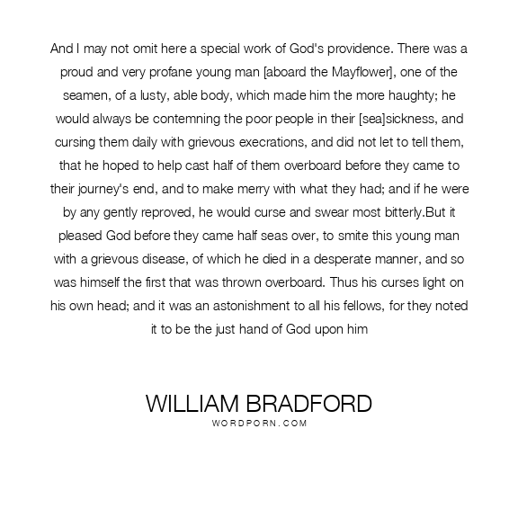 And I may not omit here a special work of God's providence. There was a proud and very profane young man [aboard the Mayflower], one of the seamen, of a lusty, able body, which made him the more haughty; he would always be contemning the poor people in their [sea]sickness, and cursing them daily with grievous execrations, and did not let to tell them, that he hoped to help cast half of them overboard before they came to their journey's end, and to make merry with what they had; and if he were by any gently reproved, he would curse and swear most bitterly.But it pleased God before they came half seas over, to smite this young man with a grievous disease, of which he died in a desperate manner, and so was himself the first that was thrown overboard. Thus his curses light on his own head; and it was an astonishment to all his fellows, for they noted it to be the just hand of God upon him