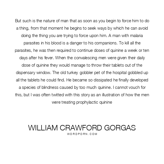 But such is the nature of man that as soon as you begin to force him to do a thing, from that moment he begins to seek ways by which he can avoid doing the thing you are trying to force upon him. A man with malaria parasites in his blood is a danger to his companions. To kill all the parasites, he was then required to continue doses of quinine a week or ten days after his fever. When the convalescing men were given their daily dose of quinine they would manage to throw their tablets out of the dispensary window. The old turkey-gobbler pet of the hospital gobbled up all the tablets he could find. He became so dissipated he finally developed a species of blindness caused by too much quinine. I cannot vouch for this, but I was often twitted with this story as an illustration of how the men were treating prophylactic quinine