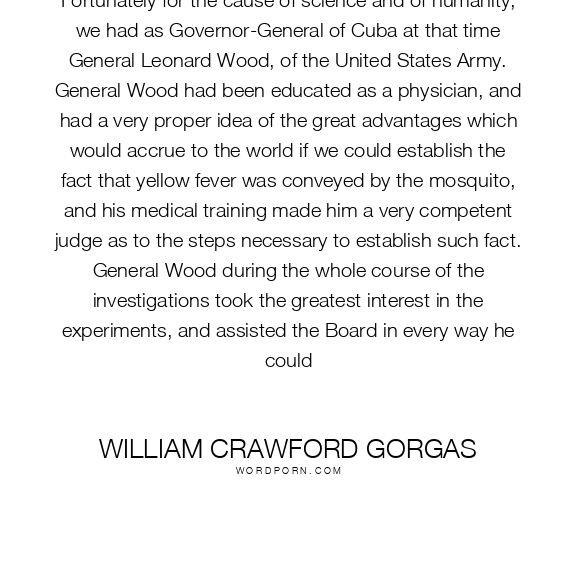 Fortunately for the cause of science and of humanity, we had as Governor-General of Cuba at that time General Leonard Wood, of the United States Army. General Wood had been educated as a physician, and had a very proper idea of the great advantages which would accrue to the world if we could establish the fact that yellow fever was conveyed by the mosquito, and his medical training made him a very competent judge as to the steps necessary to establish such fact. General Wood during the whole course of the investigations took the greatest interest in the experiments, and assisted the Board in every way he could