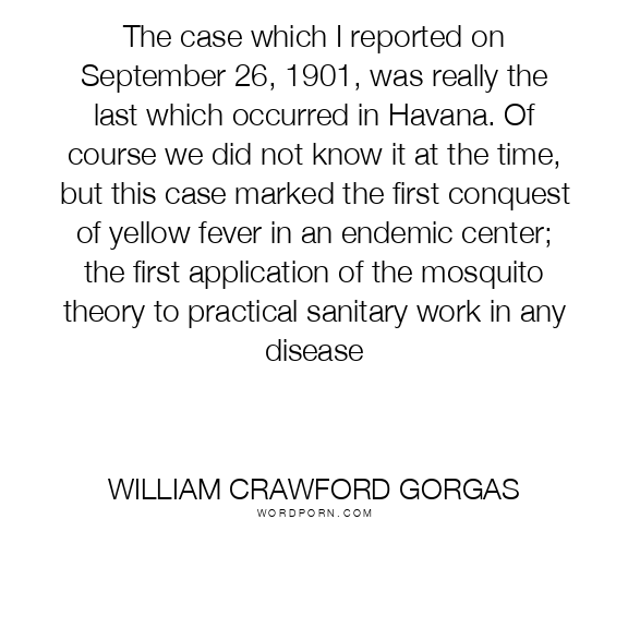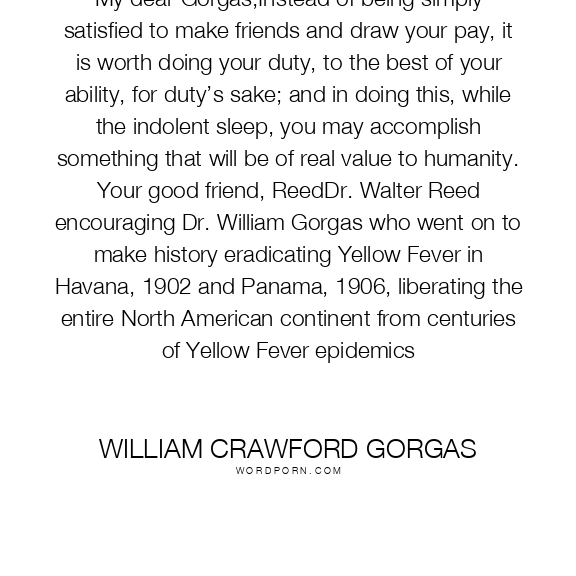 My dear Gorgas,Instead of being simply satisfied to make friends and draw your pay, it is worth doing your duty, to the best of your ability, for duty’s sake; and in doing this, while the indolent sleep, you may accomplish something that will be of real value to humanity. Your good friend, ReedDr. Walter Reed encouraging Dr. William Gorgas who went on to make history eradicating Yellow Fever in Havana, 1902 and Panama, 1906, liberating the entire North American continent from centuries of Yellow Fever epidemics