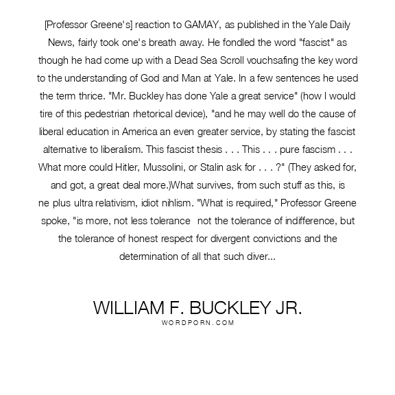 [Professor Greene's] reaction to GAMAY, as published in the Yale Daily News, fairly took one's breath away. He fondled the word "fascist" as though he had come up with a Dead Sea Scroll vouchsafing the key word to the understanding of God and Man at Yale. In a few sentences he used the term thrice. "Mr. Buckley has done Yale a great service" (how I would tire of this pedestrian rhetorical device), "and he may well do the cause of liberal education in America an even greater service, by stating the fascist alternative to liberalism. This fascist thesis . . . This . . . pure fascism . . . What more could Hitler, Mussolini, or Stalin ask for . . . ?" (They asked for, and got, a great deal more.)What survives, from such stuff as this, is ne-plus-ultra relativism, idiot nihlism. "What is required," Professor Greene spoke, "is more, not less tolerance--not the tolerance of indifference, but the tolerance of honest respect for divergent convictions and the determination of all that such divergent opinions be heard without administrative censorship. I try my best in the classroom to expound and defend my faith, when it is relevant, as honestly and persuasively as I can. But I can do so only because many of my colleagues are expounding and defending their contrasting faiths, or skepticisms, as openly and honestly as I am mine."A professor of philosophy! Question: What is the 1) ethical, 2) philosophical, or 3) epistemological argument for requiring continued tolerance of ideas whose discrediting it is the purpose of education to effect? What ethical code (in the Bible? in Plato? Kant? Hume?) requires "honest respect" for any divergent conviction?