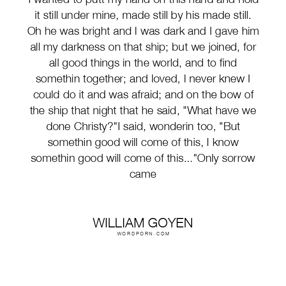I wanted to putt my hand on this hand and hold it still under mine, made still by his made still. Oh he was bright and I was dark and I gave him all my darkness on that ship; but we joined, for all good things in the world, and to find somethin together; and loved, I never knew I could do it and was afraid; and on the bow of the ship that night that he said, "What have we done Christy?"I said, wonderin too, "But somethin good will come of this, I know somethin good will come of this..."Only sorrow came