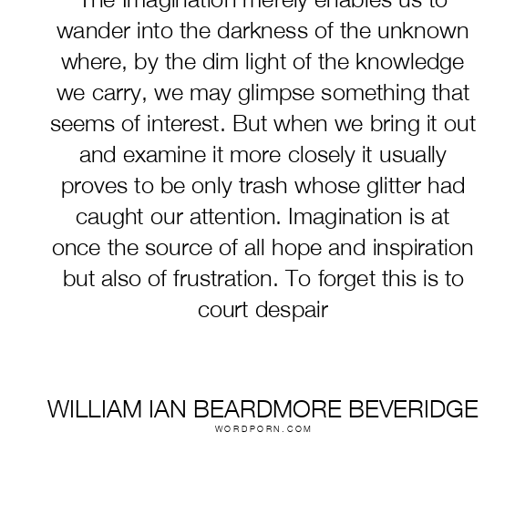 The Imagination merely enables us to wander into the darkness of the unknown where, by the dim light of the knowledge we carry, we may glimpse something that seems of interest. But when we bring it out and examine it more closely it usually proves to be only trash whose glitter had caught our attention. Imagination is at once the source of all hope and inspiration but also of frustration. To forget this is to court despair