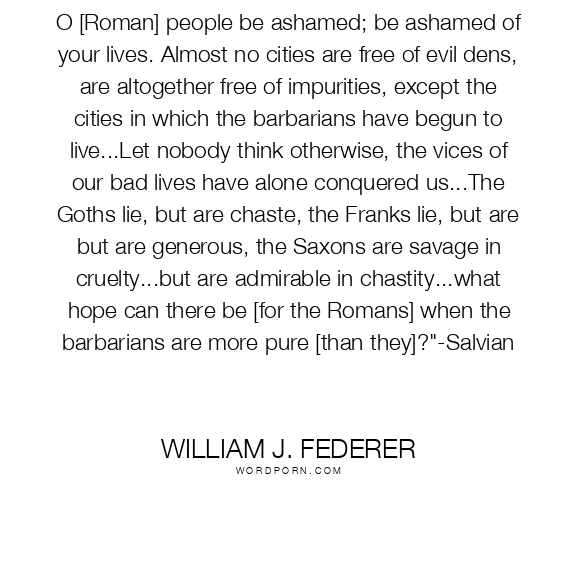 O [Roman] people be ashamed; be ashamed of your lives. Almost no cities are free of evil dens, are altogether free of impurities, except the cities in which the barbarians have begun to live...Let nobody think otherwise, the vices of our bad lives have alone conquered us...The Goths lie, but are chaste, the Franks lie, but are but are generous, the Saxons are savage in cruelty...but are admirable in chastity...what hope can there be [for the Romans] when the barbarians are more pure [than they]?"-Salvian