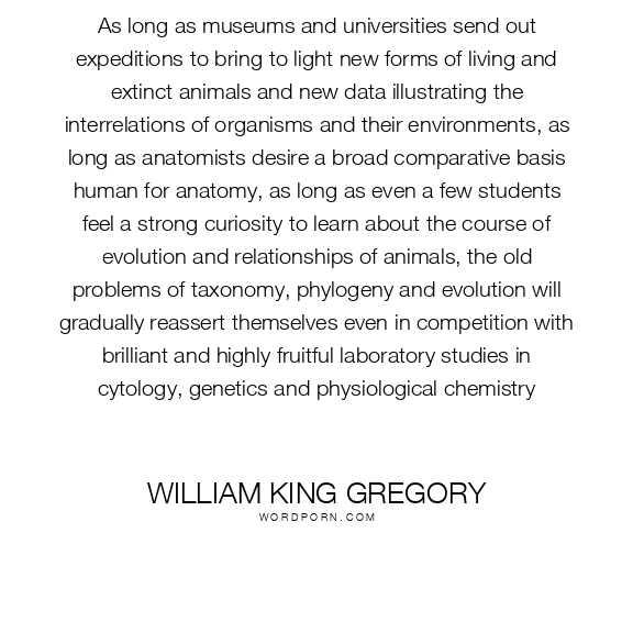 As long as museums and universities send out expeditions to bring to light new forms of living and extinct animals and new data illustrating the interrelations of organisms and their environments, as long as anatomists desire a broad comparative basis human for anatomy, as long as even a few students feel a strong curiosity to learn about the course of evolution and relationships of animals, the old problems of taxonomy, phylogeny and evolution will gradually reassert themselves even in competition with brilliant and highly fruitful laboratory studies in cytology, genetics and physiological chemistry