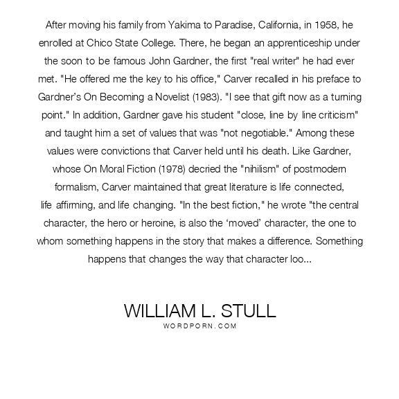 After moving his family from Yakima to Paradise, California, in 1958, he enrolled at Chico State College. There, he began an apprenticeship under the soon-to-be-famous John Gardner, the first "real writer" he had ever met. "He offered me the key to his office," Carver recalled in his preface to Gardner’s On Becoming a Novelist (1983). "I see that gift now as a turning point." In addition, Gardner gave his student "close, line-by-line criticism" and taught him a set of values that was "not negotiable." Among these values were convictions that Carver held until his death. Like Gardner, whose On Moral Fiction (1978) decried the "nihilism" of postmodern formalism, Carver maintained that great literature is life-connected, life-affirming, and life-changing. "In the best fiction," he wrote "the central character, the hero or heroine, is also the ‘moved’ character, the one to whom something happens in the story that makes a difference. Something happens that changes the way that character looks at himself and hence the world." Through the 1960s and 1970s he steered wide of the metafictional "funhouse" erected by Barth, Barthelme and Company, concentrating instead on what he called "those basics of old-fashioned storytelling: plot, character, and action." Like Gardner and Chekhov, Carver declared himself a humanist. "Art is not self-expression," he insisted, "it’s communication