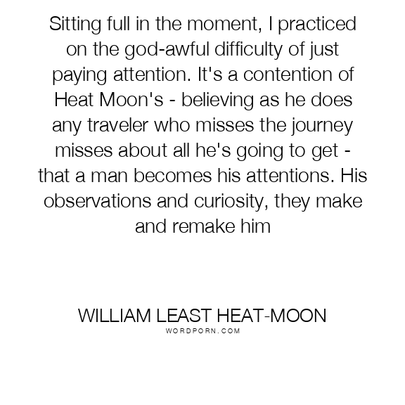 Sitting full in the moment, I practiced on the god-awful difficulty of just paying attention. It's a contention of Heat Moon's - believing as he does any traveler who misses the journey misses about all he's going to get - that a man becomes his attentions. His observations and curiosity, they make and remake him