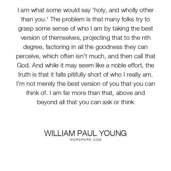 William Paul Young quote. I am what some would say 'holy, and wholly other than you.' The problem is that many folks try to grasp some sense of who I am by taking the best version of themselves, projecting that to the nth degree, factoring in all the goodness they can perceive, which often isn't much, and then call that God. And while it may seem like a noble effort, the truth is that it falls pitifully short of who I really am. I'm not merely the best version of you that you can think of. I am far more than that, above and beyond all that you can ask or think