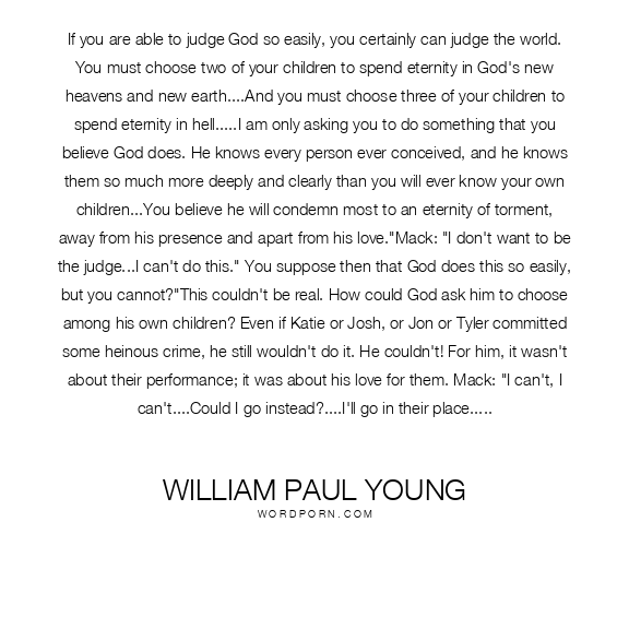 William Paul Young quote. If you are able to judge God so easily, you certainly can judge the world. You must choose two of your children to spend eternity in God's new heavens and new earth....And you must choose three of your children to spend eternity in hell.....I am only asking you to do something that you believe God does. He knows every person ever conceived, and he knows them so much more deeply and clearly than you will ever know your own children...You believe he will condemn most to an eternity of torment, away from his presence and apart from his love.