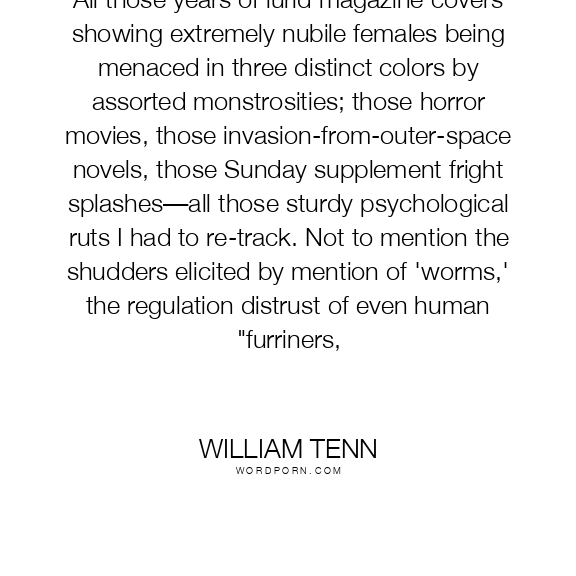 All those years of lurid magazine covers showing extremely nubile females being menaced in three distinct colors by assorted monstrosities; those horror movies, those invasion-from-outer-space novels, those Sunday supplement fright splashes—all those sturdy psychological ruts I had to re-track. Not to mention the shudders elicited by mention of 'worms,' the regulation distrust of even human "furriners,