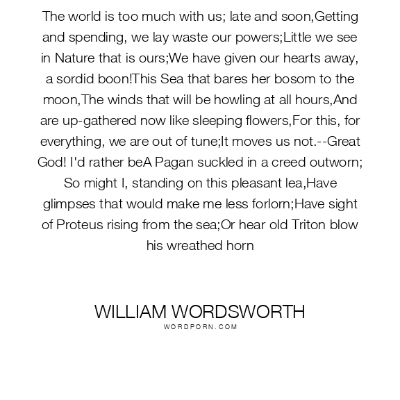 The world is too much with us; late and soon,Getting and spending, we lay waste our powers;Little we see in Nature that is ours;We have given our hearts away, a sordid boon!This Sea that bares her bosom to the moon,The winds that will be howling at all hours,And are up-gathered now like sleeping flowers,For this, for everything, we are out of tune;It moves us not.--Great God! I'd rather beA Pagan suckled in a creed outworn; So might I, standing on this pleasant lea,Have glimpses that would make me less forlorn;Have sight of Proteus rising from the sea;Or hear old Triton blow his wreathed horn