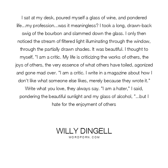 I sat at my desk, poured myself a glass of wine, and pondered life...my profession...was it meaningless? I took a long, drawn-back swig of the bourbon and slammed down the glass. I only then noticed the stream of filtered light illuminating through the window, through the partially drawn shades. It was beautiful. I thought to myself, "I am a critic. My life is criticizing the works of others, the joys of others, the very essence of what others have toiled, agonized and gone mad over. "I am a critic. I write in a magazine about how I don't like what someone else likes, merely because they wrote it." Write what you love, they always say. "I am a hater," I said, pondering the beautiful sunlight and my glass of alcohol, "...but I hate for the enjoyment of others